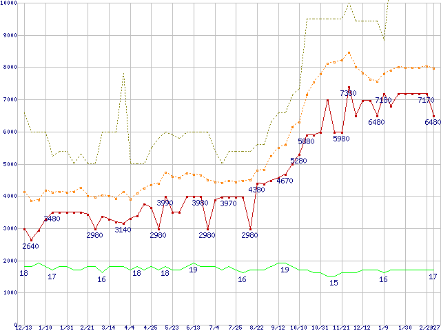 PC2-6400 2GB×2枚組みセットの価格推移↑前グラフ↓次グラフ(2008年12月13日〜2010年2月27日)※このグラフは過去のデータも税率5%相当に調整した税込み相当額のグラフです。 税率変更や、総額表示方式導入(2004年4月)の影響は除いています。●関連グラフメモリ主要製品の最安値推移4GBモジュール/2GBモジュール×2枚の最安値推移メモリ主要製品(最安値5千円〜1万円未満)の最安値推移PC2-6400(DDR2-800) DDR2 SDRAM DIMMの最安値推移PC3-10600/PC2-6400 2GB×2枚組みセットの最安値推移●凡例最安値(点線部は販売店未確認または未調査)平均値最高値ショップ数
