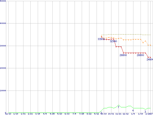PC2-6400 4GB×2枚組みセットの価格推移↑前グラフ↓次グラフ(2008年12月13日〜2010年2月27日)※このグラフは過去のデータも税率5%相当に調整した税込み相当額のグラフです。 税率変更や、総額表示方式導入(2004年4月)の影響は除いています。●関連グラフメモリ主要製品の最安値推移メモリ主要製品(最安値1万円以上)の最安値推移PC2-6400(DDR2-800) DDR2 SDRAM DIMMの最安値推移●凡例最安値(点線部は販売店未確認または未調査)平均値最高値ショップ数