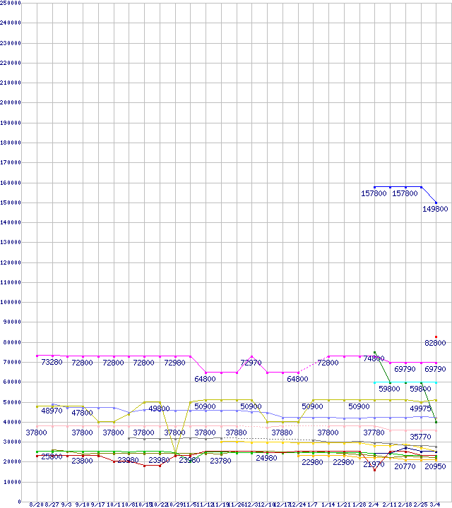 HDD/SSD主要製品(最安値2万円以上)の最安値推移↑前グラフ(2009年8月20日〜2010年3月4日)※このグラフは過去のデータも税率5%相当に調整した税込み相当額のグラフです。 税率変更や、総額表示方式導入(2004年4月)の影響は除いています。凡例2.5インチ ミドルクラスSSD 512GB (512GB,MLC)2.5インチSSD(SandForce製コントローラ) 200GB (200GB,MLC)CTFDDAC256MAG-1G1 (256GB,MLC)SSDSA2SH064G1C5 (64GB,SLC)2.5インチ ミドルクラスSSD 256GB (256GB,MLC)2.5インチ ローエンドSSD 256GB (256GB,MLC)SDSA2MH160G2C1/R1/R5 (160GB,MLC)CTFDDAC128MAG-1G1 (128GB,MLC)2.5インチSSD(SandForce製コントローラ) 100GB (100GB,MLC)SSDSA2SH032G1 (32GB,SLC)WD2001FASS (2TB,64MB)ST32000641AS (2TB,64MB)2.5インチ ミドルクラスSSD 128GB (128GB,MLC)2.5インチ ローエンドSSD 128GB (128GB,MLC)WD3000HLFS (300.0GB)SDSA2MH80G2C1/R1/R5 (80GB,MLC)X25-M(G2)OEM品SSD (80GB,MLC)※製品名をクリックすると個別のグラフを表示します※点線部は販売店が確認できなかった、または調査データがないことを示します