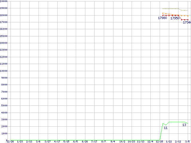 Core i5-650 (3.2GHz)の価格推移↑前グラフ↓次グラフ(2008年12月26日〜2010年3月5日)※このグラフは過去のデータも税率5%相当に調整した税込み相当額のグラフです。●関連グラフCPU主要製品の最安値推移CPU主要製品(最安値1万円〜2万円未満)の最安値推移Intel系CPUの最安値推移LGA1156 (L3キャッシュ4MB,Dual Core,GPU内蔵,Hyper-Threading,TDP 73〜87W)の最安値推移●凡例最安値(点線部は販売店未確認または未調査)平均値最高値ショップ数