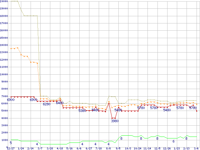 PC3-12800 1GB×2枚組みセットの価格推移↑前グラフ↓次グラフ(2008年12月27日〜2010年3月6日)※このグラフは過去のデータも税率5%相当に調整した税込み相当額のグラフです。 税率変更や、総額表示方式導入(2004年4月)の影響は除いています。●関連グラフメモリ主要製品の最安値推移2GBモジュール/1GBモジュール×2枚の最安値推移メモリ主要製品(最安値5千円未満)の最安値推移PC3-12800(DDR3-1600) DDR3 SDRAM DIMMの最安値推移●凡例最安値(点線部は販売店未確認または未調査)平均値最高値ショップ数