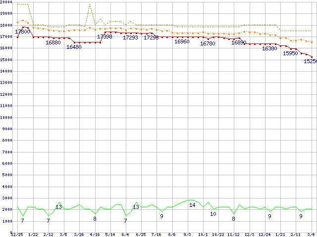 WD1500HLFS (150.0GB)の価格推移↑前グラフ↓次グラフ(2008年12月25日〜2010年3月4日)※このグラフは過去のデータも税率5%相当に調整した税込み相当額のグラフです。 税率変更や、総額表示方式導入(2004年4月)の影響は除いています。●関連グラフHDD/SSD主要製品の最安値推移HDD/SSD主要製品(最安値1万5千円〜2万円未満)の最安値推移HDD 100〜160GB未満の最安値推移WD VelociRaptor (10000rpm,3Gb/s,16MB)の最安値推移●凡例最安値(点線部は販売店未確認または未調査)平均値最高値ショップ数