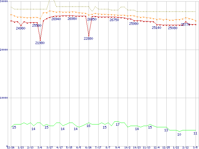 Core 2 Duo E8600 (3.33GHz,L2 6MB)の価格推移↑前グラフ↓次グラフ(2008年12月26日〜2010年3月5日)※このグラフは過去のデータも税率5%相当に調整した税込み相当額のグラフです。●関連グラフCPU主要製品の最安値推移CPU主要製品(最安値2万円〜3万円未満)の最安値推移Intel系CPUの最安値推移LGA775 (FSB 1333MHz,Dual Core,TDP 65W)の最安値推移●凡例最安値(点線部は販売店未確認または未調査)平均値最高値ショップ数