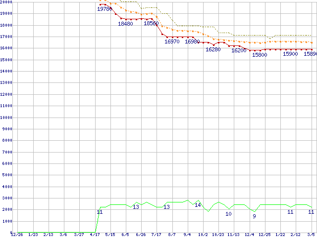 Core 2 Quad Q8400 (2.66GHz,L2 2MB×2)の価格推移↑前グラフ↓次グラフ(2008年12月26日〜2010年3月5日)※このグラフは過去のデータも税率5%相当に調整した税込み相当額のグラフです。●関連グラフCPU主要製品の最安値推移CPU主要製品(最安値1万円〜2万円未満)の最安値推移Intel系CPUの最安値推移LGA775 (FSB 1333MHz,Quad Core,TDP 95W)の最安値推移●凡例最安値(点線部は販売店未確認または未調査)平均値最高値ショップ数