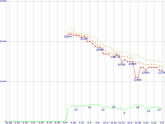 Phenom II X4 945 (3.0GHz,L2 512KB×4,L3 6MB,TDP 95W)の価格推移↑前グラフ↓次グラフ(2008年12月26日〜2010年3月5日)※このグラフは過去のデータも税率5%相当に調整した税込み相当額のグラフです。●関連グラフCPU主要製品の最安値推移CPU主要製品(最安値1万円〜2万円未満)の最安値推移AMD系CPUの最安値推移Socket AM3 (HyperTransport 3.0,Quad Core Core)の最安値推移●凡例最安値(点線部は販売店未確認または未調査)平均値最高値ショップ数