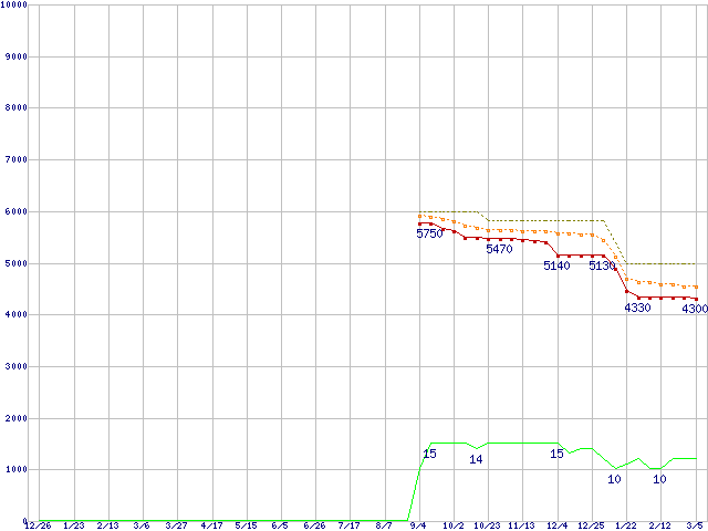 Celeron E3300 (2.5GHz)の価格推移↑前グラフ↓次グラフ(2008年12月26日〜2010年3月5日)※このグラフは過去のデータも税率5%相当に調整した税込み相当額のグラフです。●関連グラフCPU主要製品の最安値推移CPU主要製品(最安値1万円未満)の最安値推移Intel系CPUの最安値推移LGA775 (FSB 800MHz,L2 1MB,Dual Core,TDP 65W)の最安値推移●凡例最安値(点線部は販売店未確認または未調査)平均値最高値ショップ数