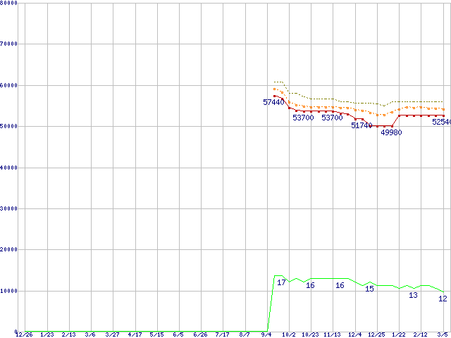 Core i7-870 (2.93GHz)の価格推移↑前グラフ↓次グラフ(2008年12月26日〜2010年3月5日)※このグラフは過去のデータも税率5%相当に調整した税込み相当額のグラフです。●関連グラフCPU主要製品の最安値推移CPU主要製品(最安値3万円〜6万円未満)の最安値推移Intel系CPUの最安値推移LGA1156 (L3キャッシュ8MB,Quad Core,Hyper-Threading,TDP 82〜95W)の最安値推移●凡例最安値(点線部は販売店未確認または未調査)平均値最高値ショップ数