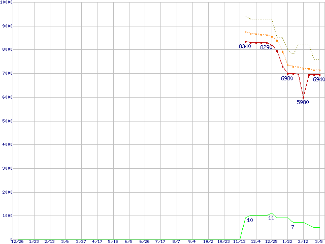 Athlon II X3 435 (2.9GHz,L2 512KB×3,TDP 95W)の価格推移↑前グラフ↓次グラフ(2008年12月26日〜2010年3月5日)※このグラフは過去のデータも税率5%相当に調整した税込み相当額のグラフです。●関連グラフCPU主要製品の最安値推移CPU主要製品(最安値1万円未満)の最安値推移AMD系CPUの最安値推移Socket AM3 (Triple Core)の最安値推移●凡例最安値(点線部は販売店未確認または未調査)平均値最高値ショップ数