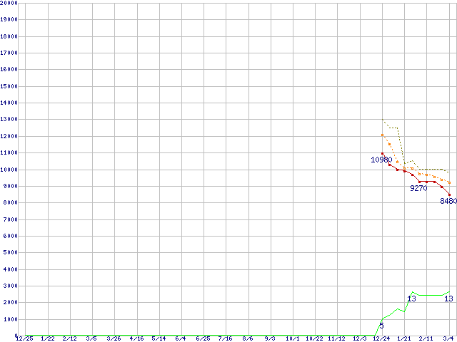 WD15EARS (1.5TB,64MB)の価格推移↑前グラフ(2008年12月25日〜2010年3月4日)※このグラフは過去のデータも税率5%相当に調整した税込み相当額のグラフです。 税率変更や、総額表示方式導入(2004年4月)の影響は除いています。●関連グラフHDD/SSD主要製品の最安値推移HDD/SSD主要製品(最安値1万円未満)の最安値推移HDD 1.5TB〜2TB未満の最安値推移WD Caviar Green (3Gb/s)の最安値推移●凡例最安値(点線部は販売店未確認または未調査)平均値最高値ショップ数