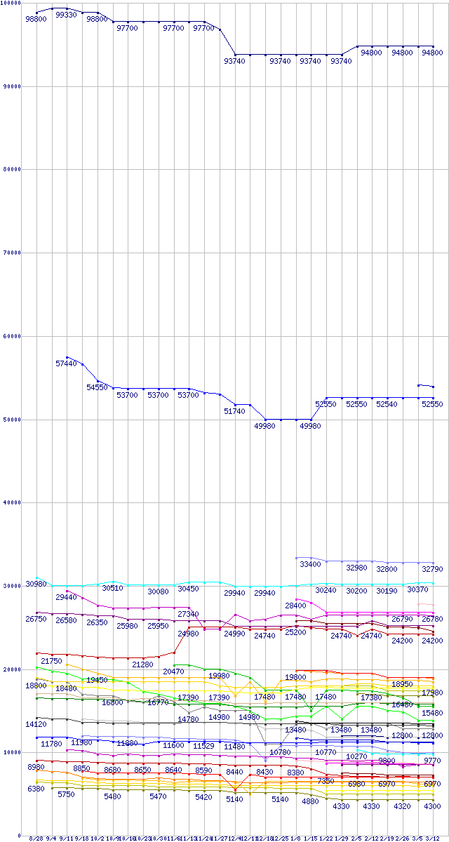CPU主要製品の最安値推移↑前グラフ↓次グラフ(2009年8月28日〜2010年3月12日)※このグラフは過去のデータも税率5%相当に調整した税込み相当額のグラフです。 税率変更や、総額表示方式導入(2004年4月)の影響は除いています。凡例Core i7-975 Extreme Edition (3.33GHz)Core i7-960 (3.20GHz)Core i7-870 (2.93GHz)Core i7-860S (2.53GHz)Core 2 Quad Q9650 (3.00GHz,L2 6MB×2)Core i7-930 (2.80GHz)Core i5-670 (3.46GHz)Core i7-860 (2.80GHz)Core 2 Duo E8600 (3.33GHz,L2 6MB)Core i5-750S (2.4GHz)Core 2 Quad Q9550 (2.83GHz,L2 6MB×2)Core i5-661 (3.33GHz)Core i5-660 (3.33GHz)Core i5-750 (2.66GHz)Core 2 Quad Q9400 (2.66GHz,L2 3MB×2)Core 2 Duo E8500 (3.16GHz,L2 6MB)Core i5-650 (3.2GHz)Phenom II X4 910e (2.6GHz,L2 512KB×4,L3 6MB,TDP 65W)Core 2 Quad Q8400 (2.66GHz,L2 2MB×2)Core 2 Duo E8400 (3GHz,L2 6MB)Phenom II X4 965 Black Edition (3.4GHz,L2 512KB×4,L3 6MB,TDP 125W)Phenom II X4 955 Black Edition (3.2GHz,L2 512KB×4,L3 6MB,TDP 125W)Core i3-540 (3.06GHz)Core 2 Duo E7600 (3.06GHz,L2 3MB)Phenom II X4 945 (3.0GHz,L2 512KB×4,L3 6MB,TDP 95W)Athlon II X4 605e (2.3GHz,L2 512KB×4,TDP 45W)Athlon II X4 635 (2.9GHz,L2 512KB×4,TDP 95W)Core i3-530 (2.93GHz)Core 2 Duo E7500 (2.93GHz,L2 3MB)Athlon II X4 630 (2.8GHz,L2 512KB×4,TDP 95W)Phenom II X2 555 Black Edition (3.2GHz,L2 512KB×2,L3 6MB)Pentium G6950 (2.8GHz)Pentium E6600 (3.06GHz,L2 2MB)Athlon II X4 620 (2.6GHz,L2 512KB×4,TDP 95W)Athlon II X3 440 (3.0GHz,L2 512KB×3,TDP 95W)Athlon II X2 255 (3.1GHz,L2 1MB×2,TDP 65W)Pentium E6500 (2.93GHz,L2 2MB)Athlon II X2 240e (2.8GHz,L2 1MB×2,TDP 45W)Athlon II X2 250 (3.0GHz,L2 1MB×2,TDP 65W)Athlon II X2 235e (2.7GHz,L2 1MB×2,TDP 45W)Athlon II X2 245 (2.9GHz,L2 1MB×2,TDP 65W)Celeron E3400 (2.6GHz)Athlon II X2 240 (2.8GHz,L2 1MB×2,TDP 65W)Celeron E3300 (2.5GHz)※製品名をクリックすると個別のグラフを表示します※点線部は販売店が確認できなかった、または調査データがないことを示します