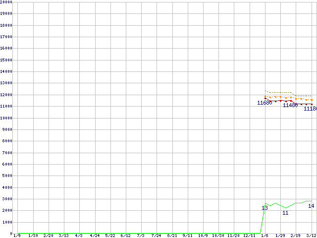 Core i3-530 (2.93GHz)の価格推移↑前グラフ↓次グラフ(2009年1月9日〜2010年3月12日)※このグラフは過去のデータも税率5%相当に調整した税込み相当額のグラフです。 税率変更や、総額表示方式導入(2004年4月)の影響は除いています。●関連グラフCPU主要製品の最安値推移CPU主要製品(最安値1万円〜2万円未満)の最安値推移Intel系CPUの最安値推移LGA1156 (L3キャッシュ4MB,Dual Core,GPU内蔵,Hyper-Threading,TDP 73〜87W)の最安値推移●凡例最安値(点線部は販売店未確認または未調査)平均値最高値ショップ数