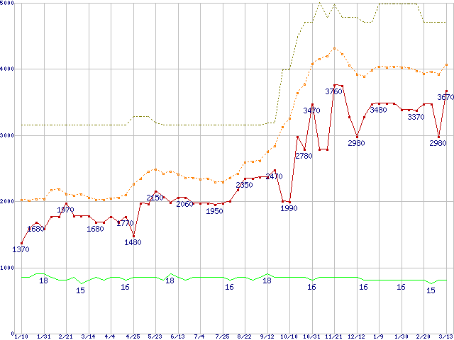 PC2-6400 2GBの価格推移↑前グラフ↓次グラフ(2009年1月10日〜2010年3月13日)※このグラフは過去のデータも税率5%相当に調整した税込み相当額のグラフです。 税率変更や、総額表示方式導入(2004年4月)の影響は除いています。●関連グラフメモリ主要製品の最安値推移2GBモジュール/1GBモジュール×2枚の最安値推移メモリ主要製品(最安値5千円未満)の最安値推移PC2-6400(DDR2-800) DDR2 SDRAM DIMMの最安値推移●凡例最安値(点線部は販売店未確認または未調査)平均値最高値ショップ数