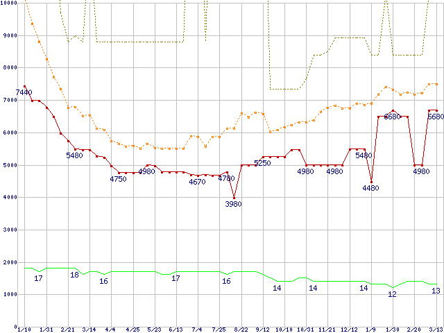 PC3-10600 1GB×3枚組みセットの価格推移↑前グラフ↓次グラフ(2009年1月10日〜2010年3月13日)※このグラフは過去のデータも税率5%相当に調整した税込み相当額のグラフです。 税率変更や、総額表示方式導入(2004年4月)の影響は除いています。●関連グラフメモリ主要製品の最安値推移メモリ主要製品(最安値5千円〜1万円未満)の最安値推移PC3-10600(DDR3-1333) DDR3 SDRAM DIMMの最安値推移●凡例最安値(点線部は販売店未確認または未調査)平均値最高値ショップ数
