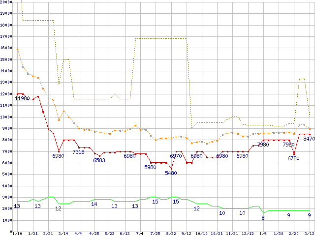PC3-12800 1GB×3枚組みセットの価格推移↑前グラフ↓次グラフ(2009年1月10日〜2010年3月13日)※このグラフは過去のデータも税率5%相当に調整した税込み相当額のグラフです。 税率変更や、総額表示方式導入(2004年4月)の影響は除いています。●関連グラフメモリ主要製品の最安値推移メモリ主要製品(最安値5千円〜1万円未満)の最安値推移PC3-12800(DDR3-1600) DDR3 SDRAM DIMMの最安値推移●凡例最安値(点線部は販売店未確認または未調査)平均値最高値ショップ数
