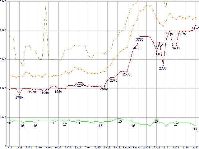 PC2-6400 1GB×2枚組みセットの価格推移↑前グラフ↓次グラフ(2009年1月10日〜2010年3月13日)※このグラフは過去のデータも税率5%相当に調整した税込み相当額のグラフです。 税率変更や、総額表示方式導入(2004年4月)の影響は除いています。●関連グラフメモリ主要製品の最安値推移2GBモジュール/1GBモジュール×2枚の最安値推移メモリ主要製品(最安値5千円未満)の最安値推移PC2-6400(DDR2-800) DDR2 SDRAM DIMMの最安値推移●凡例最安値(点線部は販売店未確認または未調査)平均値最高値ショップ数