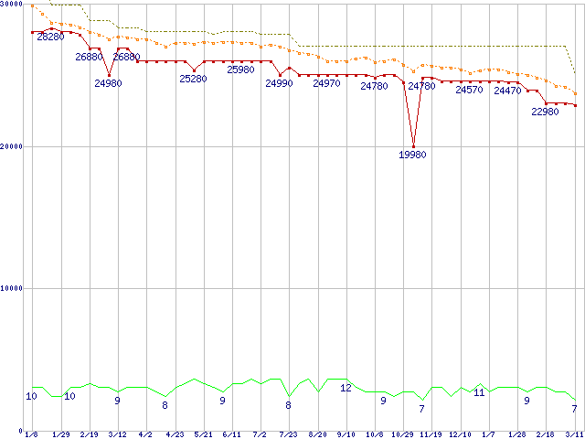 WD3000HLFS (300.0GB)の価格推移↑前グラフ↓次グラフ(2009年1月8日〜2010年3月11日)※このグラフは過去のデータも税率5%相当に調整した税込み相当額のグラフです。 税率変更や、総額表示方式導入(2004年4月)の影響は除いています。●関連グラフHDD/SSD主要製品の最安値推移HDD/SSD主要製品(最安値2万円以上)の最安値推移HDD 300〜400GB未満の最安値推移WD VelociRaptor (10000rpm,3Gb/s,16MB)の最安値推移●凡例最安値(点線部は販売店未確認または未調査)平均値最高値ショップ数