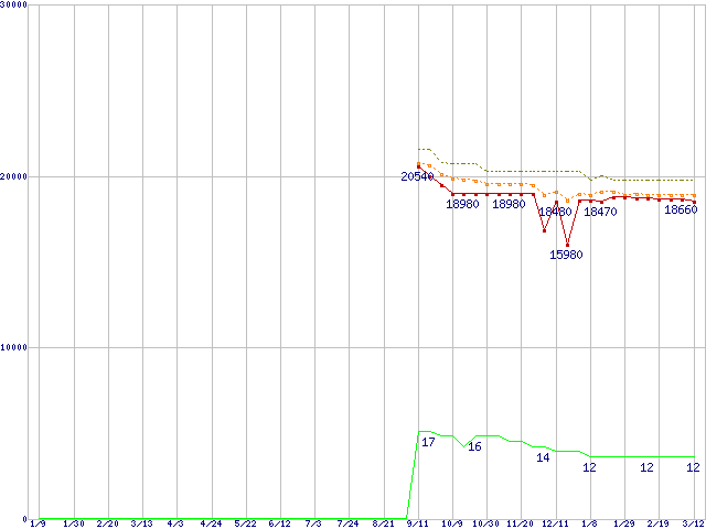 Core i5-750 (2.66GHz)の価格推移↑前グラフ↓次グラフ(2009年1月9日〜2010年3月12日)※このグラフは過去のデータも税率5%相当に調整した税込み相当額のグラフです。 税率変更や、総額表示方式導入(2004年4月)の影響は除いています。●関連グラフCPU主要製品の最安値推移CPU主要製品(最安値1万円〜2万円未満)の最安値推移Intel系CPUの最安値推移LGA1156 (L3キャッシュ8MB,Quad Core,TDP 82〜95W)の最安値推移●凡例最安値(点線部は販売店未確認または未調査)平均値最高値ショップ数