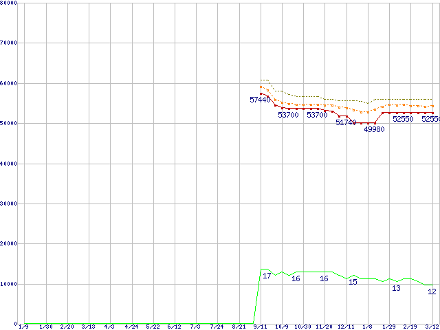 Core i7-870 (2.93GHz)の価格推移↑前グラフ↓次グラフ(2009年1月9日〜2010年3月12日)※このグラフは過去のデータも税率5%相当に調整した税込み相当額のグラフです。 税率変更や、総額表示方式導入(2004年4月)の影響は除いています。●関連グラフCPU主要製品の最安値推移CPU主要製品(最安値3万円〜6万円未満)の最安値推移Intel系CPUの最安値推移LGA1156 (L3キャッシュ8MB,Quad Core,Hyper-Threading,TDP 82〜95W)の最安値推移●凡例最安値(点線部は販売店未確認または未調査)平均値最高値ショップ数