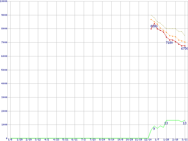 WD10EARS (1TB,64MB)の価格推移↑前グラフ↓次グラフ(2009年1月8日〜2010年3月11日)※このグラフは過去のデータも税率5%相当に調整した税込み相当額のグラフです。 税率変更や、総額表示方式導入(2004年4月)の影響は除いています。●関連グラフHDD/SSD主要製品の最安値推移HDD/SSD主要製品(最安値1万円未満)の最安値推移HDD 1TB〜1.5TB未満の最安値推移WD Caviar Green (3Gb/s)の最安値推移●凡例最安値(点線部は販売店未確認または未調査)平均値最高値ショップ数
