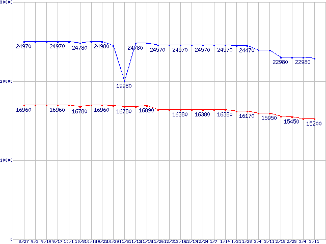 | WD VelociRaptor (10000rpm,3Gb/s,16MB)の最安値推移 |