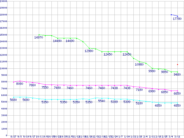 | WD Scorpio Blue (5200〜5400rpm,3Gb/s,2.5インチ)の最安値推移 |