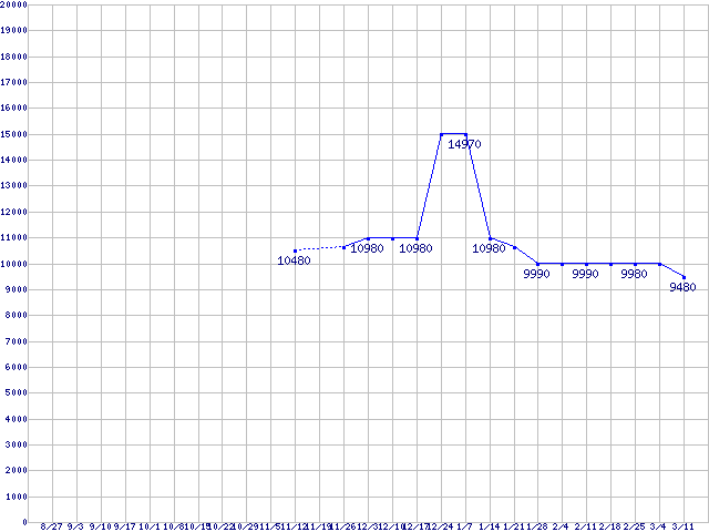 | SSDNow V (SSD,3Gb/s,2.5インチ,リード170MB/s・ライト40MB/s)の最安値推移 |