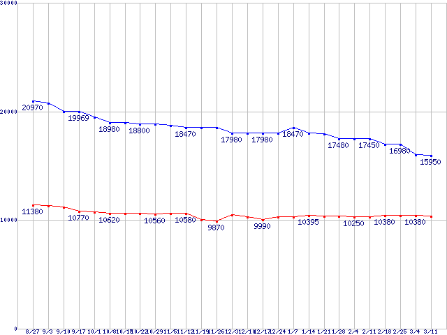 | Barracuda LP (5900rpm,3Gb/s)の最安値推移 |