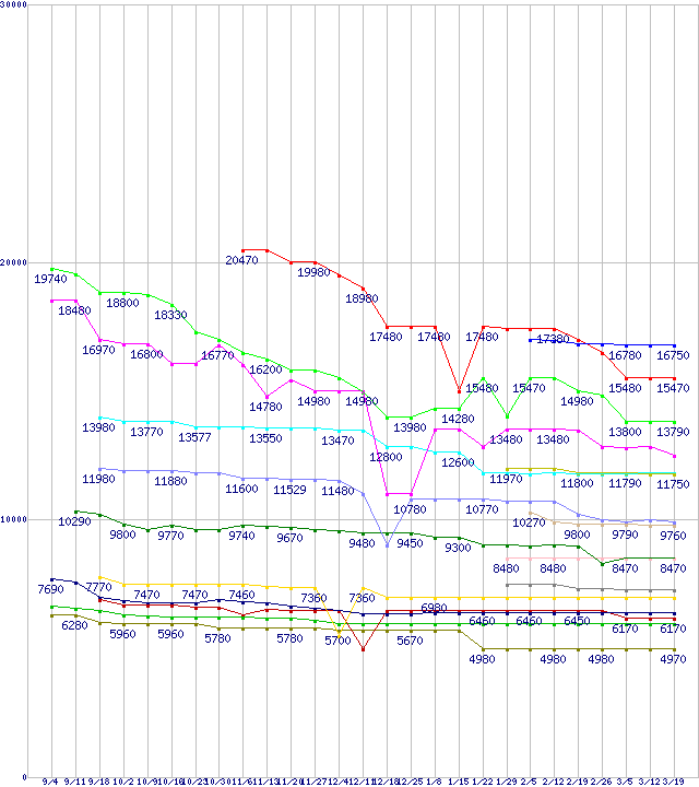 AMD系CPUの最安値推移↑前グラフ↓次グラフ(2009年9月4日〜2010年3月19日)※このグラフは過去のデータも税率5%相当に調整した税込み相当額のグラフです。 税率変更や、総額表示方式導入(2004年4月)の影響は除いています。凡例Phenom II X4 910e (2.6GHz,L2 512KB×4,L3 6MB,TDP 65W)Phenom II X4 965 Black Edition (3.4GHz,L2 512KB×4,L3 6MB,TDP 125W)Phenom II X4 955 Black Edition (3.2GHz,L2 512KB×4,L3 6MB,TDP 125W)Phenom II X4 945 (3.0GHz,L2 512KB×4,L3 6MB,TDP 95W)Athlon II X4 605e (2.3GHz,L2 512KB×4,TDP 45W)Athlon II X4 635 (2.9GHz,L2 512KB×4,TDP 95W)Athlon II X4 630 (2.8GHz,L2 512KB×4,TDP 95W)Phenom II X2 555 Black Edition (3.2GHz,L2 512KB×2,L3 6MB)Athlon II X4 620 (2.6GHz,L2 512KB×4,TDP 95W)Athlon II X3 440 (3.0GHz,L2 512KB×3,TDP 95W)Athlon II X2 255 (3.1GHz,L2 1MB×2,TDP 65W)Athlon II X2 240e (2.8GHz,L2 1MB×2,TDP 45W)Athlon II X2 250 (3.0GHz,L2 1MB×2,TDP 65W)Athlon II X2 235e (2.7GHz,L2 1MB×2,TDP 45W)Athlon II X2 245 (2.9GHz,L2 1MB×2,TDP 65W)Athlon II X2 240 (2.8GHz,L2 1MB×2,TDP 65W)※製品名をクリックすると個別のグラフを表示します※点線部は販売店が確認できなかった、または調査データがないことを示します