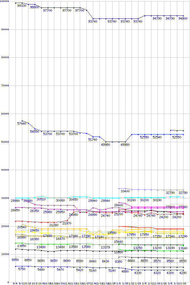 Intel系CPUの最安値推移↑前グラフ↓次グラフ(2009年9月4日〜2010年3月19日)※このグラフは過去のデータも税率5%相当に調整した税込み相当額のグラフです。 税率変更や、総額表示方式導入(2004年4月)の影響は除いています。凡例Core i7-975 Extreme Edition (3.33GHz)Core i7-960 (3.20GHz)Core i7-870 (2.93GHz)Core i7-860S (2.53GHz)Core 2 Quad Q9650 (3.00GHz,L2 6MB×2)Core i7-930 (2.80GHz)Core i5-670 (3.46GHz)Core i7-860 (2.80GHz)Core 2 Duo E8600 (3.33GHz,L2 6MB)Core i5-750S (2.4GHz)Core 2 Quad Q9550 (2.83GHz,L2 6MB×2)Core i5-661 (3.33GHz)Core i5-660 (3.33GHz)Core i5-750 (2.66GHz)Core 2 Quad Q9400 (2.66GHz,L2 3MB×2)Core 2 Duo E8500 (3.16GHz,L2 6MB)Core i5-650 (3.2GHz)Core 2 Quad Q8400 (2.66GHz,L2 2MB×2)Core 2 Duo E8400 (3GHz,L2 6MB)Core i3-540 (3.06GHz)Core 2 Duo E7600 (3.06GHz,L2 3MB)Core i3-530 (2.93GHz)Core 2 Duo E7500 (2.93GHz,L2 3MB)Pentium G6950 (2.8GHz)Pentium E6600 (3.06GHz,L2 2MB)Pentium E6500 (2.93GHz,L2 2MB)Celeron E3400 (2.6GHz)Celeron E3300 (2.5GHz)※製品名をクリックすると個別のグラフを表示します※点線部は販売店が確認できなかった、または調査データがないことを示します
