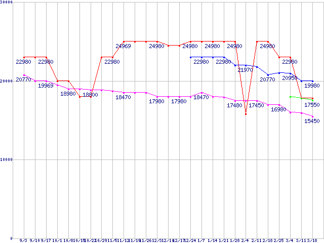 | HDD/SSD主要製品(最安値1万5千円〜2万円未満)の最安値推移 |