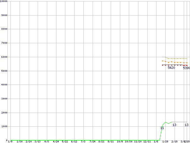 Celeron E3400 (2.6GHz)の価格推移↑前グラフ↓次グラフ(2009年1月9日〜2010年3月19日)※このグラフは過去のデータも税率5%相当に調整した税込み相当額のグラフです。 税率変更や、総額表示方式導入(2004年4月)の影響は除いています。●関連グラフCPU主要製品の最安値推移CPU主要製品(最安値1万円未満)の最安値推移Intel系CPUの最安値推移LGA775 (FSB 800MHz,L2 1MB,Dual Core,TDP 65W)の最安値推移●凡例最安値(点線部は販売店未確認または未調査)平均値最高値ショップ数