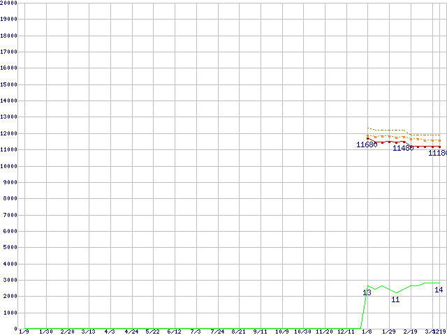 Core i3-530 (2.93GHz)の価格推移↑前グラフ↓次グラフ(2009年1月9日〜2010年3月19日)※このグラフは過去のデータも税率5%相当に調整した税込み相当額のグラフです。 税率変更や、総額表示方式導入(2004年4月)の影響は除いています。●関連グラフCPU主要製品の最安値推移CPU主要製品(最安値1万円〜2万円未満)の最安値推移Intel系CPUの最安値推移LGA1156 (L3キャッシュ4MB,Dual Core,GPU内蔵,Hyper-Threading,TDP 73〜87W)の最安値推移●凡例最安値(点線部は販売店未確認または未調査)平均値最高値ショップ数