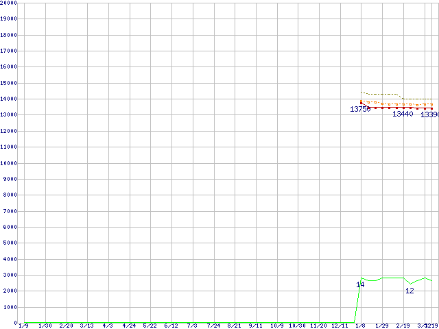 Core i3-540 (3.06GHz)の価格推移↑前グラフ↓次グラフ(2009年1月9日〜2010年3月19日)※このグラフは過去のデータも税率5%相当に調整した税込み相当額のグラフです。 税率変更や、総額表示方式導入(2004年4月)の影響は除いています。●関連グラフCPU主要製品の最安値推移CPU主要製品(最安値1万円〜2万円未満)の最安値推移Intel系CPUの最安値推移LGA1156 (L3キャッシュ4MB,Dual Core,GPU内蔵,Hyper-Threading,TDP 73〜87W)の最安値推移●凡例最安値(点線部は販売店未確認または未調査)平均値最高値ショップ数
