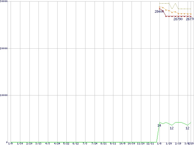 Core i5-670 (3.46GHz)の価格推移↑前グラフ↓次グラフ(2009年1月9日〜2010年3月19日)※このグラフは過去のデータも税率5%相当に調整した税込み相当額のグラフです。 税率変更や、総額表示方式導入(2004年4月)の影響は除いています。●関連グラフCPU主要製品の最安値推移CPU主要製品(最安値2万円〜3万円未満)の最安値推移Intel系CPUの最安値推移LGA1156 (L3キャッシュ4MB,Dual Core,GPU内蔵,Hyper-Threading,TDP 73〜87W)の最安値推移●凡例最安値(点線部は販売店未確認または未調査)平均値最高値ショップ数