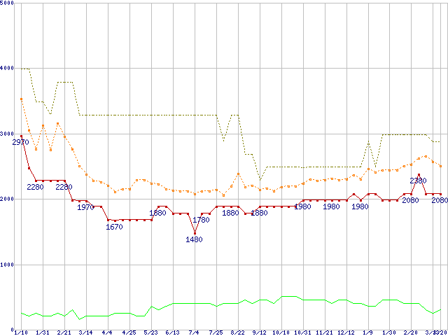 PC3-10600 1GBの価格推移↓次グラフ(2009年1月10日〜2010年3月20日)※このグラフは過去のデータも税率5%相当に調整した税込み相当額のグラフです。 税率変更や、総額表示方式導入(2004年4月)の影響は除いています。●関連グラフメモリ主要製品の最安値推移1GBモジュールの最安値推移メモリ主要製品(最安値5千円未満)の最安値推移PC3-10600(DDR3-1333) DDR3 SDRAM DIMMの最安値推移●凡例最安値(点線部は販売店未確認または未調査)平均値最高値ショップ数