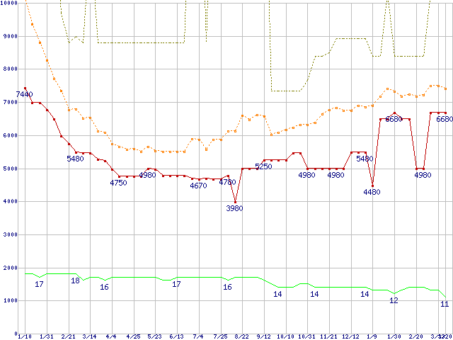 PC3-10600 1GB×3枚組みセットの価格推移↑前グラフ↓次グラフ(2009年1月10日〜2010年3月20日)※このグラフは過去のデータも税率5%相当に調整した税込み相当額のグラフです。 税率変更や、総額表示方式導入(2004年4月)の影響は除いています。●関連グラフメモリ主要製品の最安値推移メモリ主要製品(最安値5千円〜1万円未満)の最安値推移PC3-10600(DDR3-1333) DDR3 SDRAM DIMMの最安値推移●凡例最安値(点線部は販売店未確認または未調査)平均値最高値ショップ数