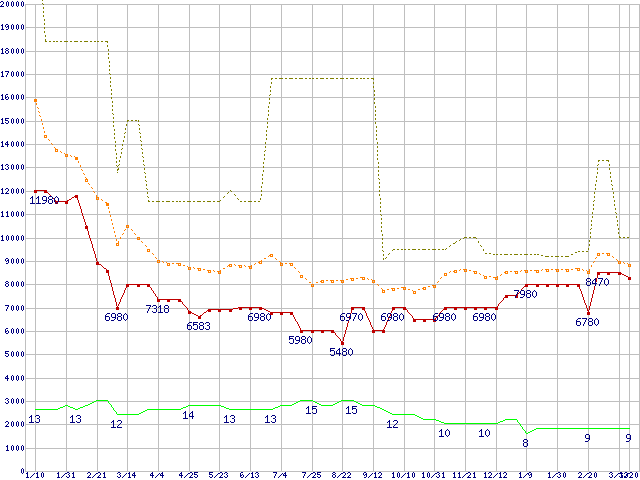 PC3-12800 1GB×3枚組みセットの価格推移↑前グラフ↓次グラフ(2009年1月10日〜2010年3月20日)※このグラフは過去のデータも税率5%相当に調整した税込み相当額のグラフです。 税率変更や、総額表示方式導入(2004年4月)の影響は除いています。●関連グラフメモリ主要製品の最安値推移メモリ主要製品(最安値5千円〜1万円未満)の最安値推移PC3-12800(DDR3-1600) DDR3 SDRAM DIMMの最安値推移●凡例最安値(点線部は販売店未確認または未調査)平均値最高値ショップ数