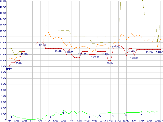 PC2-6400 4GBの価格推移↑前グラフ(2009年1月10日〜2010年3月20日)※このグラフは過去のデータも税率5%相当に調整した税込み相当額のグラフです。 税率変更や、総額表示方式導入(2004年4月)の影響は除いています。●関連グラフメモリ主要製品の最安値推移4GBモジュール/2GBモジュール×2枚の最安値推移メモリ主要製品(最安値1万円以上)の最安値推移PC2-6400(DDR2-800) DDR2 SDRAM DIMMの最安値推移●凡例最安値(点線部は販売店未確認または未調査)平均値最高値ショップ数