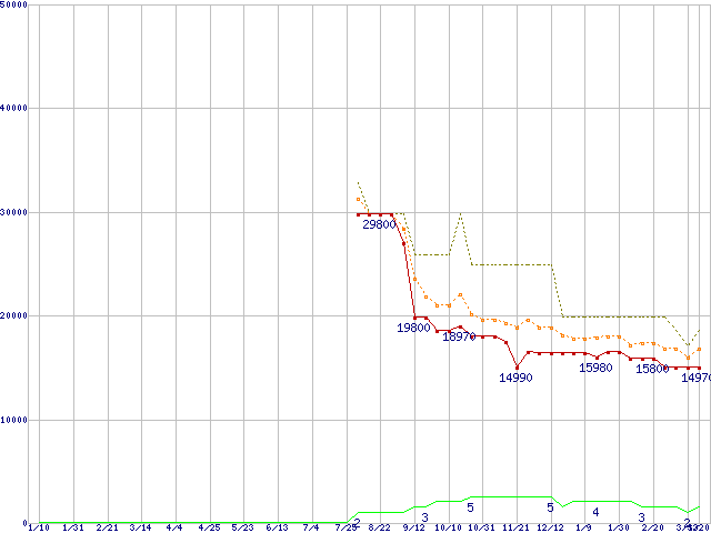 PC3-10600 4GBの価格推移↑前グラフ↓次グラフ(2009年1月10日〜2010年3月20日)※このグラフは過去のデータも税率5%相当に調整した税込み相当額のグラフです。 税率変更や、総額表示方式導入(2004年4月)の影響は除いています。●関連グラフメモリ主要製品の最安値推移4GBモジュール/2GBモジュール×2枚の最安値推移メモリ主要製品(最安値1万円以上)の最安値推移PC3-10600(DDR3-1333) DDR3 SDRAM DIMMの最安値推移●凡例最安値(点線部は販売店未確認または未調査)平均値最高値ショップ数