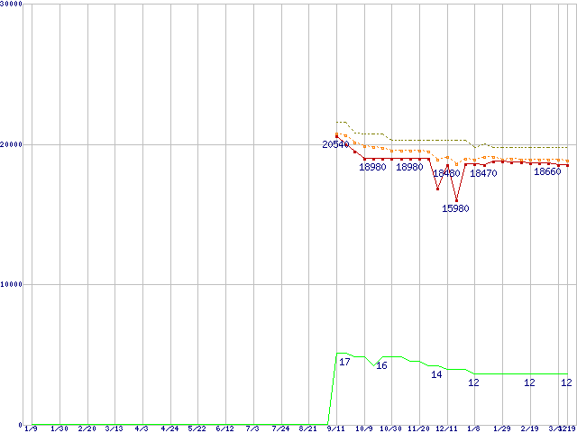Core i5-750 (2.66GHz)の価格推移↑前グラフ↓次グラフ(2009年1月9日〜2010年3月19日)※このグラフは過去のデータも税率5%相当に調整した税込み相当額のグラフです。 税率変更や、総額表示方式導入(2004年4月)の影響は除いています。●関連グラフCPU主要製品の最安値推移CPU主要製品(最安値1万円〜2万円未満)の最安値推移Intel系CPUの最安値推移LGA1156 (L3キャッシュ8MB,Quad Core,TDP 82〜95W)の最安値推移●凡例最安値(点線部は販売店未確認または未調査)平均値最高値ショップ数