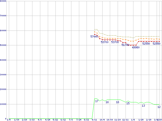 Core i7-870 (2.93GHz)の価格推移↑前グラフ↓次グラフ(2009年1月9日〜2010年3月19日)※このグラフは過去のデータも税率5%相当に調整した税込み相当額のグラフです。 税率変更や、総額表示方式導入(2004年4月)の影響は除いています。●関連グラフCPU主要製品の最安値推移CPU主要製品(最安値3万円〜6万円未満)の最安値推移Intel系CPUの最安値推移LGA1156 (L3キャッシュ8MB,Quad Core,Hyper-Threading,TDP 82〜95W)の最安値推移●凡例最安値(点線部は販売店未確認または未調査)平均値最高値ショップ数