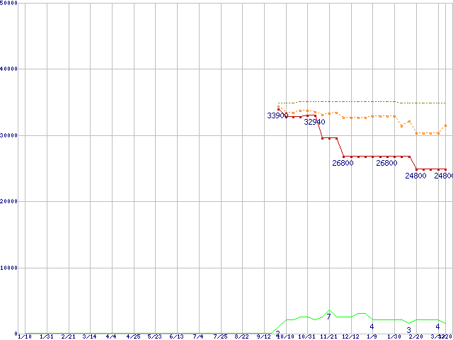 PC2-6400 4GB×2枚組みセットの価格推移↑前グラフ↓次グラフ(2009年1月10日〜2010年3月20日)※このグラフは過去のデータも税率5%相当に調整した税込み相当額のグラフです。 税率変更や、総額表示方式導入(2004年4月)の影響は除いています。●関連グラフメモリ主要製品の最安値推移メモリ主要製品(最安値1万円以上)の最安値推移PC2-6400(DDR2-800) DDR2 SDRAM DIMMの最安値推移●凡例最安値(点線部は販売店未確認または未調査)平均値最高値ショップ数