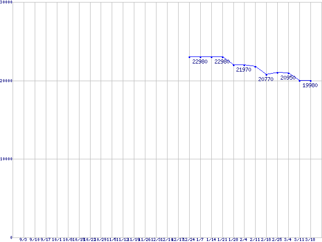 | X25-M(G2) (SSD,3Gb/s,2.5インチ,リード250MB/s・ライト70MB/s)の最安値推移 |