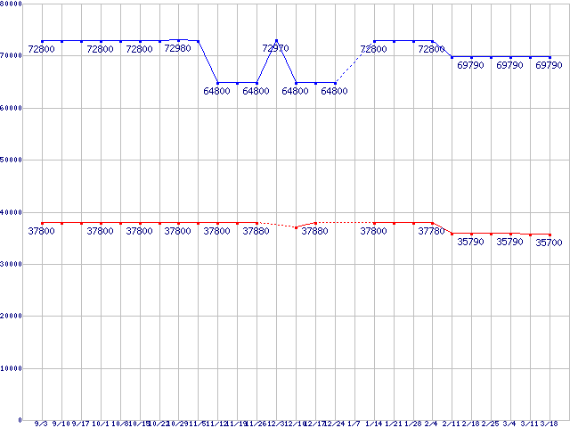 | X25-E Extreme SATA SSD (SSD,3Gb/s,2.5インチ,リード250MB/s・ライト170MB/s)の最安値推移 |