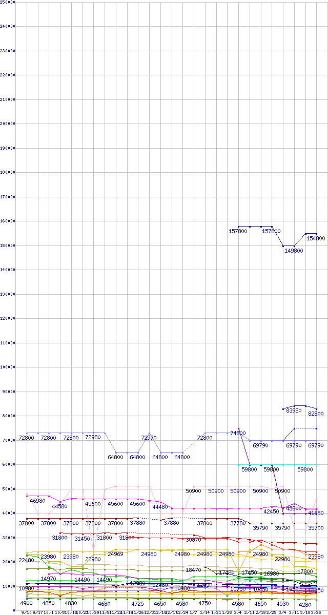HDD/SSD主要製品の最安値推移↑前グラフ↓次グラフ(2009年9月10日〜2010年3月25日)※このグラフは過去のデータも税率5%相当に調整した税込み相当額のグラフです。 税率変更や、総額表示方式導入(2004年4月)の影響は除いています。凡例2.5インチ ミドルクラスSSD 512GB (512GB,MLC)2.5インチSSD(SandForce製コントローラ) 200GB (200GB,MLC)CTFDDAC256MAG-1G1 (256GB,MLC)SSDSA2SH064G1C5 (64GB,SLC)2.5インチ ミドルクラスSSD 256GB (256GB,MLC)2.5インチ ローエンドSSD 256GB (256GB,MLC)SDSA2MH160G2C1/R1/R5 (160GB,MLC)CTFDDAC128MAG-1G1 (128GB,MLC)2.5インチSSD(SandForce製コントローラ) 100GB (100GB,MLC)SSDSA2SH032G1 (32GB,SLC)WD2001FASS (2TB,64MB)ST32000641AS (2TB,64MB)2.5インチ ミドルクラスSSD 128GB (128GB,MLC)SDSA2MH80G2C1/R1/R5 (80GB,MLC)X25-M(G2)OEM品SSD (80GB,MLC)WD10TPVT (1TB,8MB,12.5mm厚)2.5インチ ローエンドSSD 128GB (128GB,MLC)WD1500HLFS (150.0GB)ST32000542AS (2TB,32MB)2.5インチ ミドルクラスSSD 64GB (64GB,MLC)HDS722020ALA330 (2TB,32MB)2.5インチ ローエンドSSD 64GB (64GB,MLC)WD20EARS (2TB,64MB)HD203WI (2TB,32MB)SSDSA2MP040G2R5 (40GB,MLC)ST31500541AS (1.5TB,32MB)ST31500341AS (1.5TB,32MB)WD6400BPVT (640GB,8MB)WD1002FAEX (1TB,64MB)2.5インチ ローエンドSSD 32GB (32GB,MLC)2.5インチ ミドルクラスSSD 32GB (32GB,MLC)HM641JI (640GB,8MB)WD6400BEVT (640GB,8MB)HD154UI (1.5TB,32MB)WD15EARS (1.5TB,64MB)WD10EALS (1TB,32MB)ST31000528AS (1TB,32MB)HD103SJ (1TB,32MB)HDS721010CLA332 (1TB,32MB)WD10EARS (1TB,64MB)HTS545050B9A300 (500GB,8MB)WD5000BEVT (500GB,8MB)HD103SI (1TB,32MB)HDS721050CLA362 (500GB,16MB)HTS545032B9A300 (320GB,8MB)ST3500418AS (500GB,16MB)※製品名をクリックすると個別のグラフを表示します※点線部は販売店が確認できなかった、または調査データがないことを示します