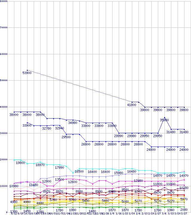 メモリ主要製品の最安値推移↑前グラフ↓次グラフ(2009年9月12日〜2010年3月27日)※このグラフは過去のデータも税率5%相当に調整した税込み相当額のグラフです。 税率変更や、総額表示方式導入(2004年4月)の影響は除いています。凡例PC3-12800 4GB×2枚組みセットPC3-10600 4GB×2枚組みセットPC2-6400 4GB×2枚組みセットPC3-12800 2GB×3枚組みセットPC3-10600 4GBPC3-10600 2GB×3枚組みセットPC2-6400 4GBPC3-12800 2GB×2枚組みセットPC3-10600 2GB×2枚組みセットPC3-12800 1GB×3枚組みセットPC3-10600 1GB×3枚組みセットPC2-6400 2GB×2枚組みセットPC3-12800 1GB×2枚組みセットPC3-12800 2GBPC3-10600 1GB×2枚組みセットPC3-10600 2GBPC2-6400 1GB×2枚組みセットPC2-6400 2GBPC3-12800 1GBPC3-10600 1GBPC2-6400 1GB※製品名をクリックすると個別のグラフを表示します※点線部は販売店が確認できなかった、または調査データがないことを示します