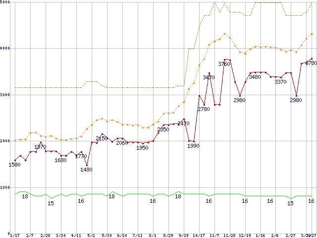 PC2-6400 2GBの価格推移↑前グラフ↓次グラフ(2009年1月17日〜2010年3月27日)※このグラフは過去のデータも税率5%相当に調整した税込み相当額のグラフです。 税率変更や、総額表示方式導入(2004年4月)の影響は除いています。●関連グラフメモリ主要製品の最安値推移2GBモジュール/1GBモジュール×2枚の最安値推移メモリ主要製品(最安値5千円未満)の最安値推移PC2-6400(DDR2-800) DDR2 SDRAM DIMMの最安値推移●凡例最安値(点線部は販売店未確認または未調査)平均値最高値ショップ数