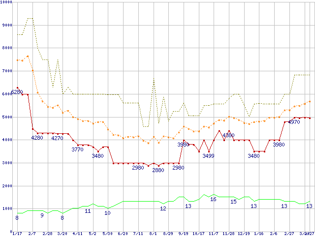 PC3-10600 1GB×2枚組みセットの価格推移↑前グラフ↓次グラフ(2009年1月17日〜2010年3月27日)※このグラフは過去のデータも税率5%相当に調整した税込み相当額のグラフです。 税率変更や、総額表示方式導入(2004年4月)の影響は除いています。●関連グラフメモリ主要製品の最安値推移2GBモジュール/1GBモジュール×2枚の最安値推移メモリ主要製品(最安値5千円未満)の最安値推移PC3-10600(DDR3-1333) DDR3 SDRAM DIMMの最安値推移●凡例最安値(点線部は販売店未確認または未調査)平均値最高値ショップ数