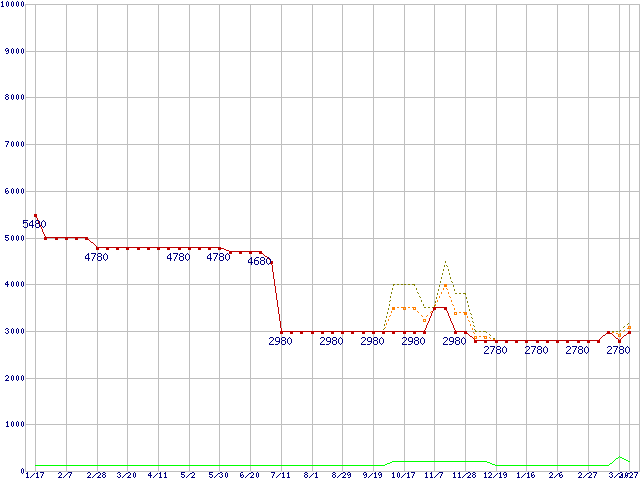 PC3-12800 1GBの価格推移↑前グラフ↓次グラフ(2009年1月17日〜2010年3月27日)※このグラフは過去のデータも税率5%相当に調整した税込み相当額のグラフです。 税率変更や、総額表示方式導入(2004年4月)の影響は除いています。●関連グラフメモリ主要製品の最安値推移1GBモジュールの最安値推移メモリ主要製品(最安値5千円未満)の最安値推移PC3-12800(DDR3-1600) DDR3 SDRAM DIMMの最安値推移●凡例最安値(点線部は販売店未確認または未調査)平均値最高値ショップ数
