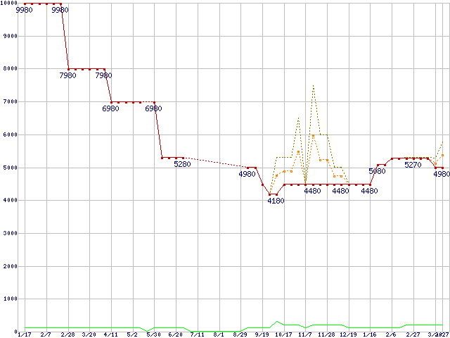 PC3-12800 2GBの価格推移↑前グラフ↓次グラフ(2009年1月17日〜2010年3月27日)※このグラフは過去のデータも税率5%相当に調整した税込み相当額のグラフです。 税率変更や、総額表示方式導入(2004年4月)の影響は除いています。●関連グラフメモリ主要製品の最安値推移2GBモジュール/1GBモジュール×2枚の最安値推移メモリ主要製品(最安値5千円未満)の最安値推移PC3-12800(DDR3-1600) DDR3 SDRAM DIMMの最安値推移●凡例最安値(点線部は販売店未確認または未調査)平均値最高値ショップ数